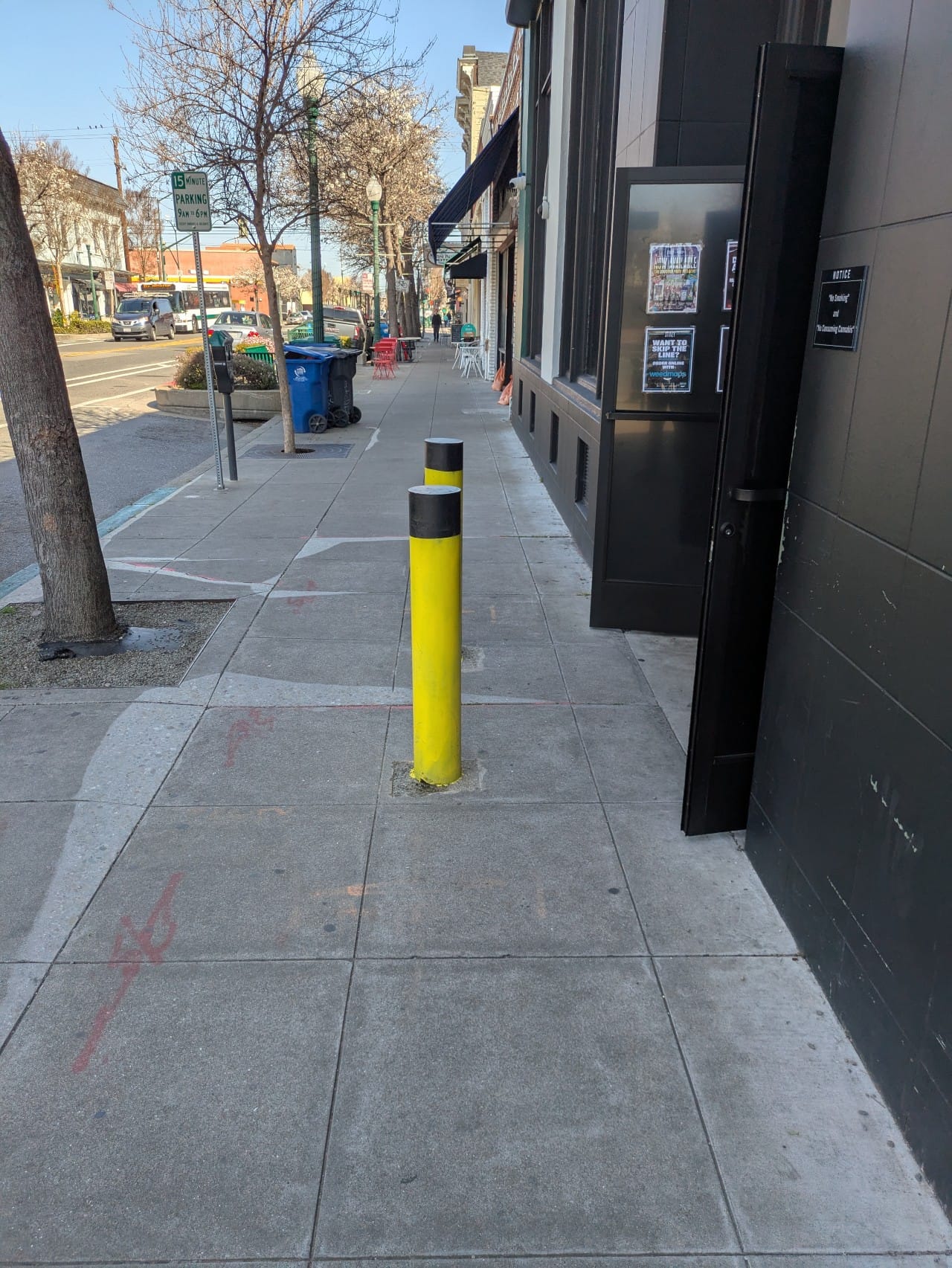 This marijuana dispensary was most certainly not thinking about PROWAG or the ADA when they installed these fixed obstacles into the public right-of-way on Webster St. They were probably only thinking about hypothetical nighttime robbers aiming to break open the business's doors with a car.