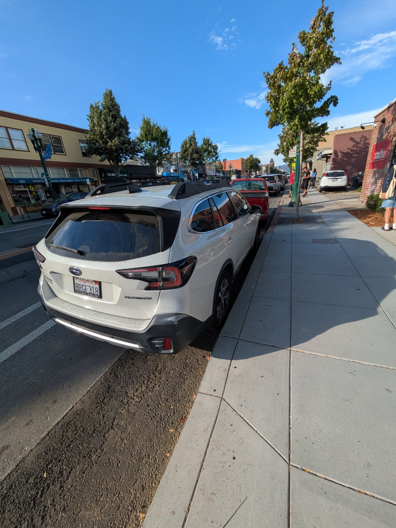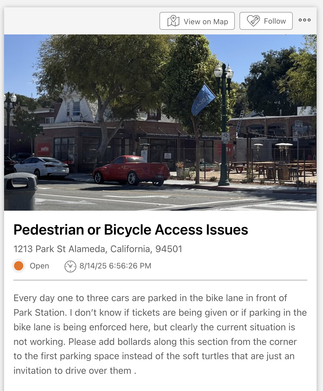 While the red car in the background is violating a visible red curb, the fault for the white car's parking in the bike lane actually lies with Park Station and the City of Alameda. When the taproom's contractors rebuilt that segment of sidewalk in July, they didn't paint the new curb red. (Previously it was a curb cut.) Now it may look like a legal parking spot, even though it's squarely in the bike lane.