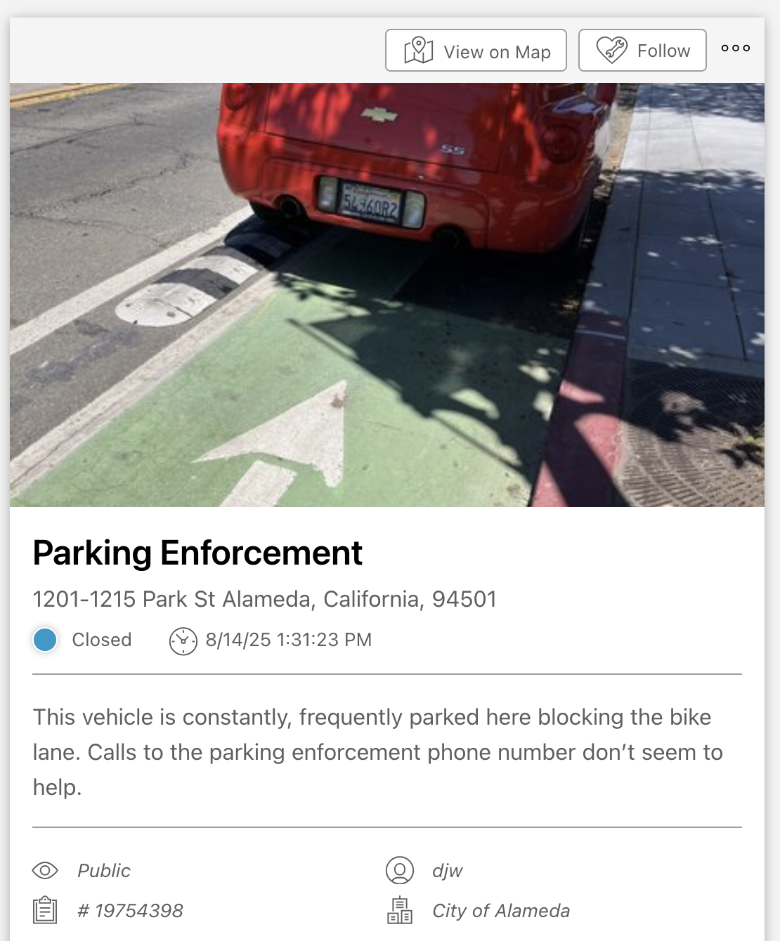 I reported this missing red paint on SeeClickFix on August 16. Turns out someone else also reported the problem on August 14: although they tagged it as a parking enforcement problem, their photo clearly shows it's a problem with curb paint. And a third person reported overall parking problems as well on August 14: