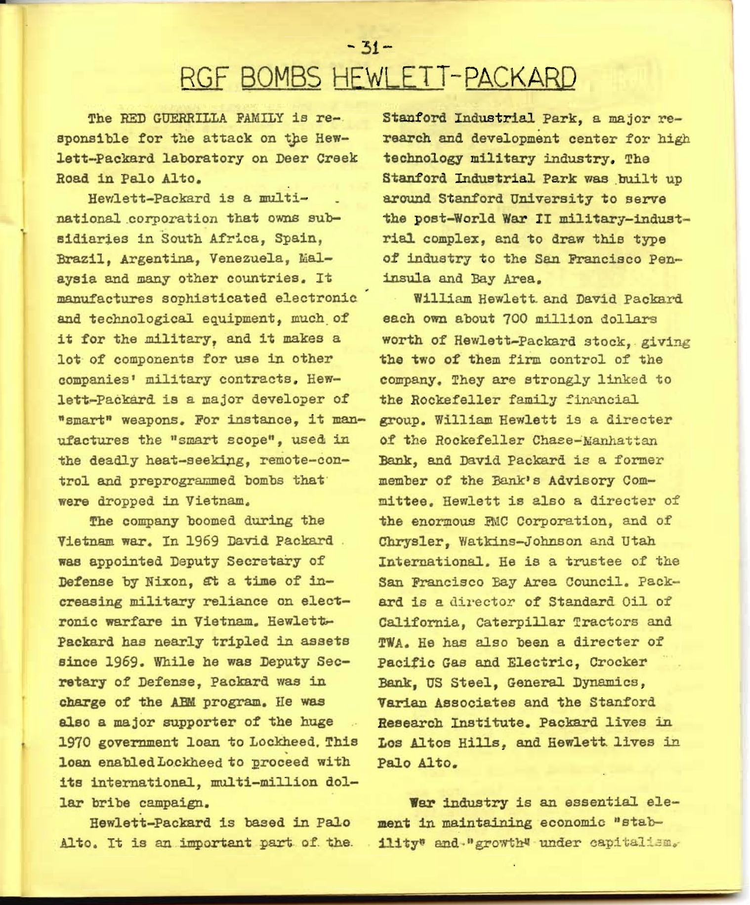 - As a kid when I would visit my dad in his various offices at Hewlett -Packard Laboratories, we'd often first drive through a gate, even though their work was for civilian/commercial purposes. HP had fenced off all of their facilities after a radical group exploded a bomb in a company building. I recalled the vague story, but never knew exactly when it was. It was in 1976 according to the LA Times, as well as according to the bombers' typewritten newsletter that's been scanned and archived online: