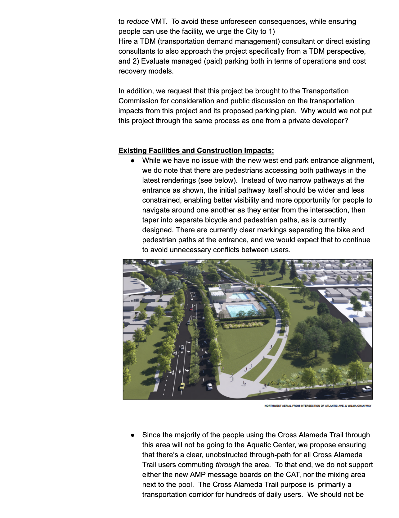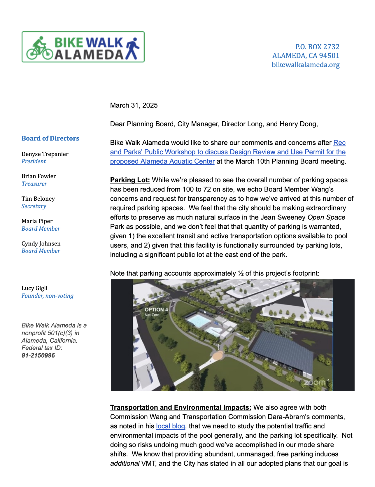 Here's a letter from Bike Walk Alameda making similar points, as well as providing context from the March meeting of the Planning Board: