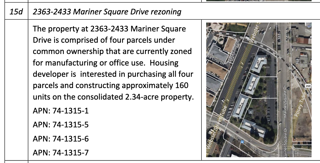 While the correspondence packet is quite quiet, one next-door neighbor has written into the Planning Board to question the density and the height and the traffic of the proposed new project. I started searching through older agenda packets to find when a previous generation of Alamedans likely wrote in to oppose the Tri Pointe Homes complex in which this current resident is now enabled to live — and to take for granted to the point that they can argue against more housing next door. But time is short, so I'll let you find the video of those prior Planning Board and City Council meetings...