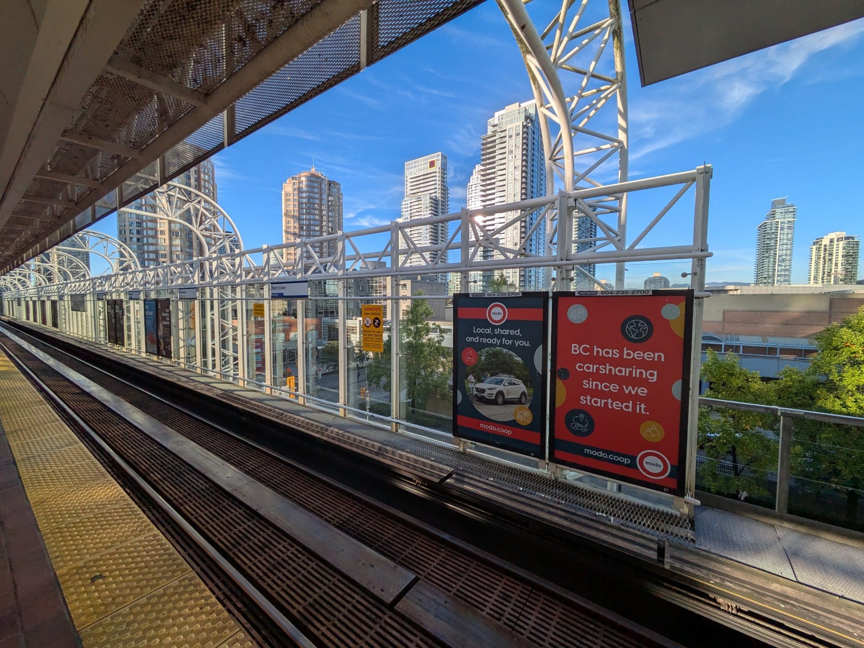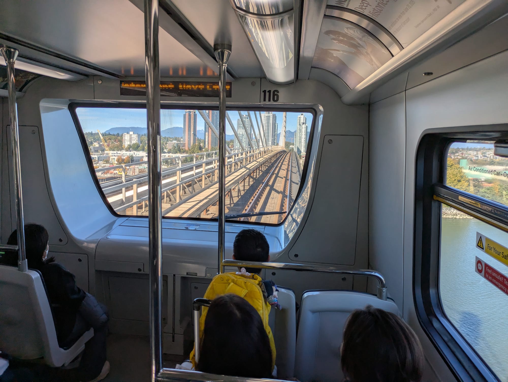 SkyTrain, the rail system, is fully automated (and fully grade separated). It's just like a people mover at an American airport or a Disney resort — across the entire region. The trains are short (only 2 cars, compared to a BART train that can be up to 10 cars) but make up for their relatively small capacity with their frequency. When one train was too crowded in the evening, my colleague and I waited for the next — which arrived in approximately 90 seconds.
