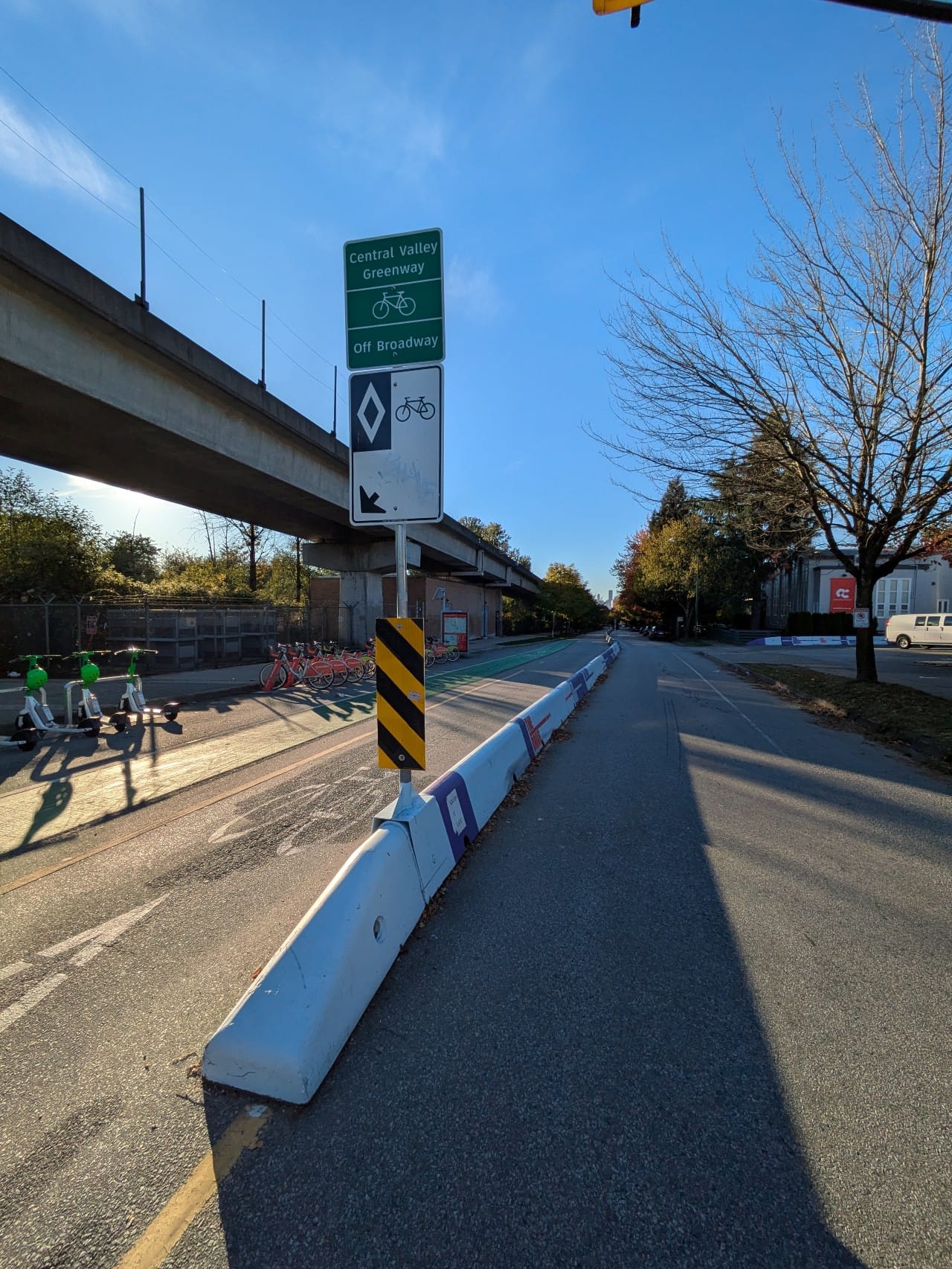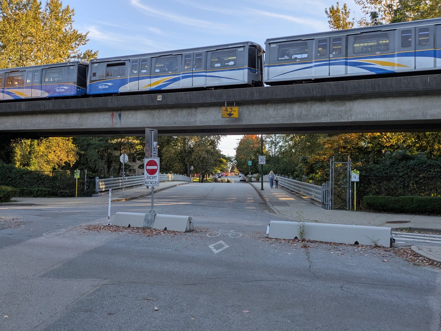 Vancouver planners also deploy low wall concrete barriers to serve as modal filters, allowing through certain modes of traffic and blocking others: