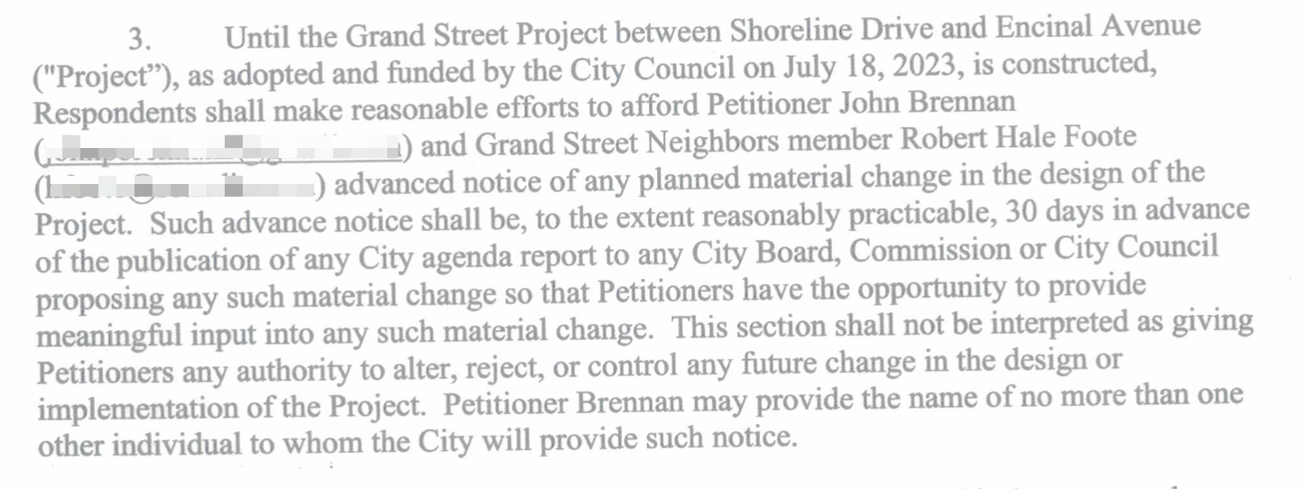 The Grand Street Neighbors — who appear to number two (2) in total — are now to be given more advance notice of any future meetings regarding this project than members of the City Council or Transportation Commission receive.