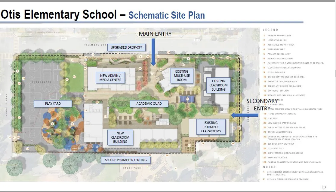 Once construction is completed (after a projected two school years, during which time Otis Elementary students will travel across town to the temporary campus near Grand St and Otis Dr) the renovated campus will look like this: