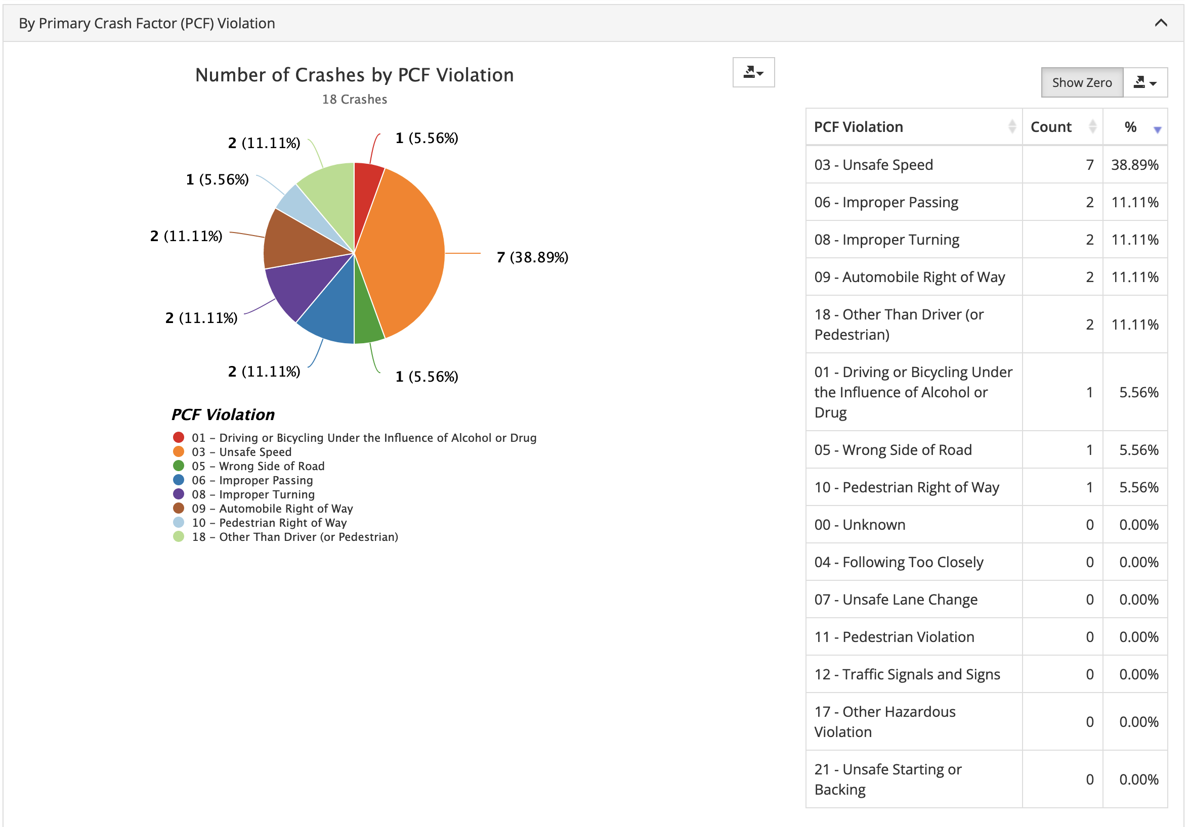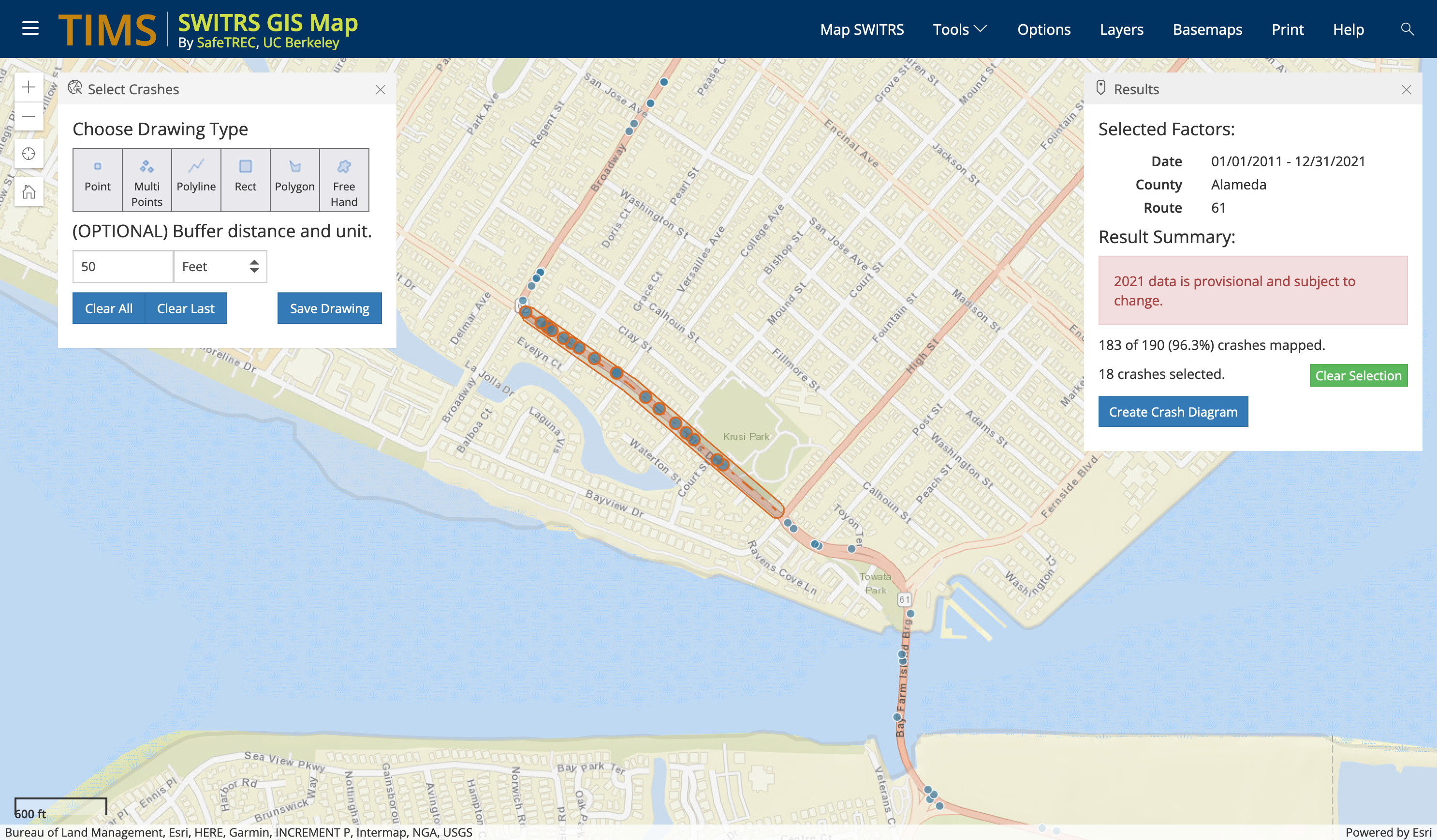 CHP collects crash reports from law-enforcement agencies around the state in the SWITRS database, which are georeferenced by the SafeTREC center at UC Berkeley and can be queried and visualized using the GIS map in their TIMS tools. [How many acronyms can I squeeze into that single sentence?] But there's a typical lag time of over a year for crash reports to make their way through all those systems. And this only accounts for crashes in which police came out and prepared reports.