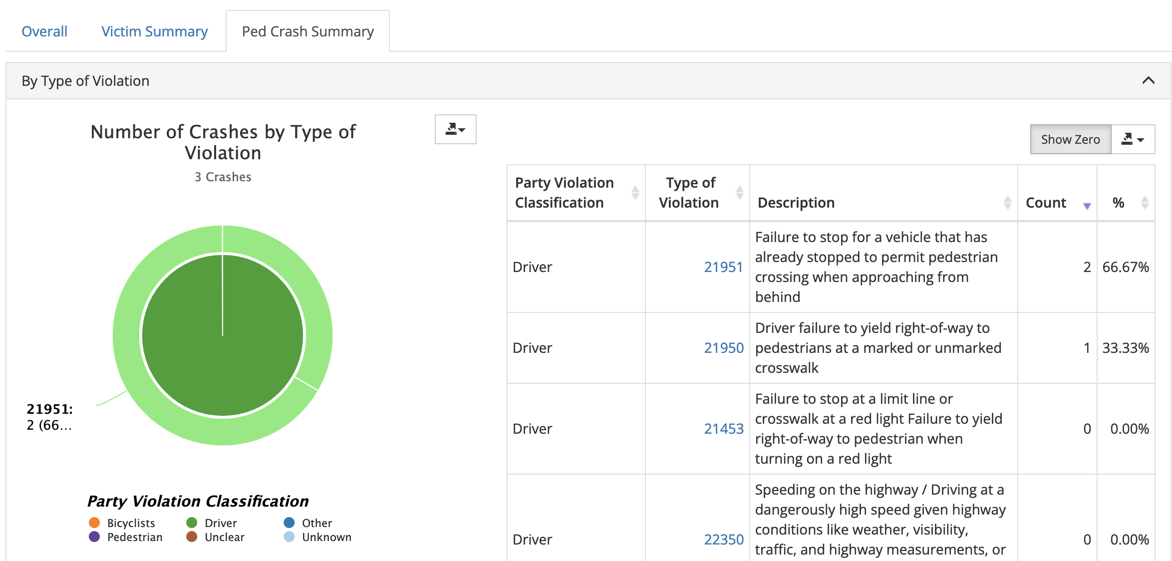 Of the 18 total crashes, 3 were vehicle-on-pedestrian crashes. In all 3 situations, the driver was deemed at fault by the police report: