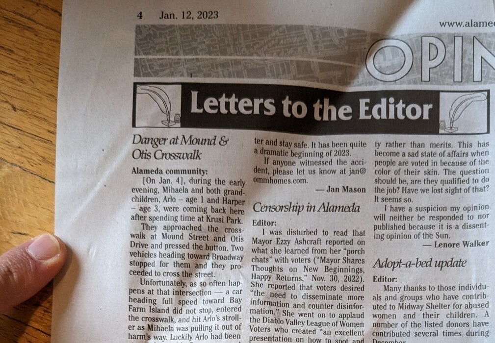 [Alameda Sun, letter to the editor, January 12, 2023, headlined Danger at Mound & Otis Crosswalk]