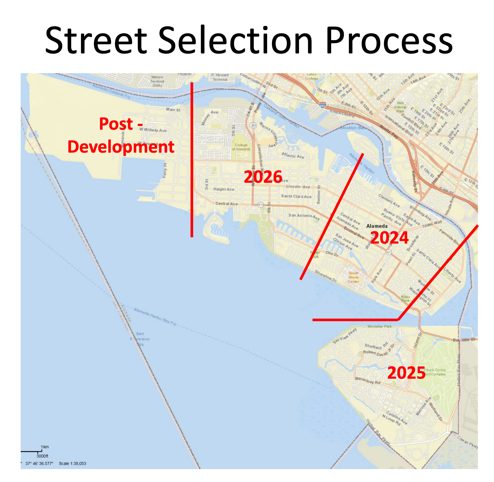 Alameda's Pavement Management Program happens annually. As "phase 43" implies, this process has been happening for a while. Each year, city staff move across the city, picking some roads to repave and reseal in a 1/3 slice of the city: