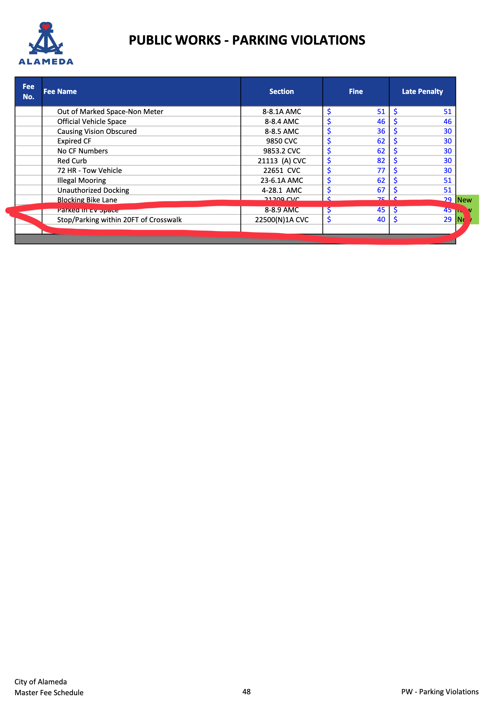 Alameda City Council, at its recent June 3 meeting, adopted a new fine that the city's parking enforcement staff will be apply to vehicles parked or stopped in those critical 20 feet leading up to a crosswalk: