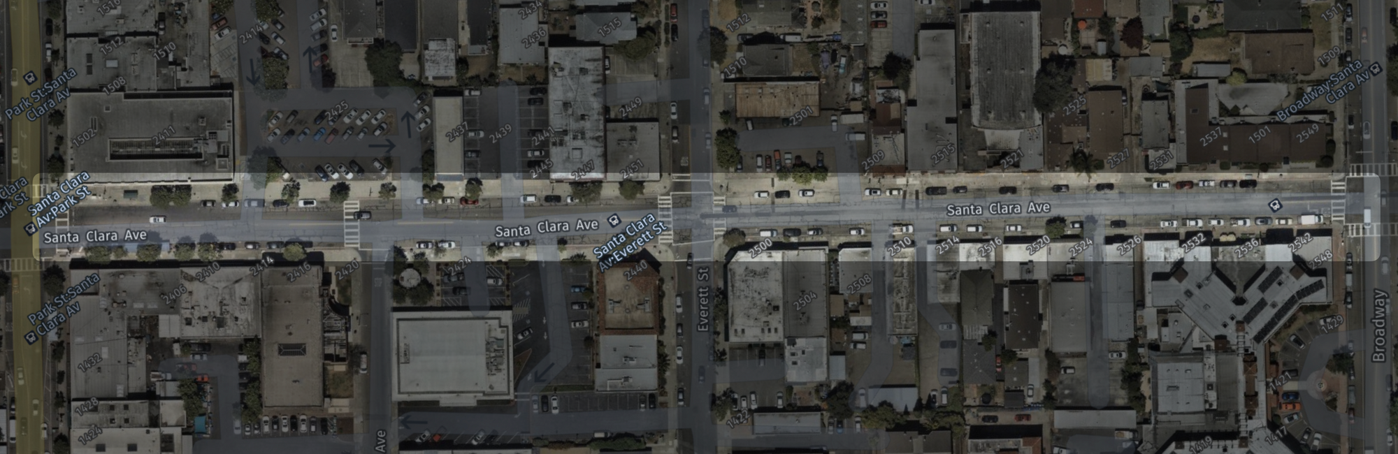 For motorists, this is, in effect, a physically inconsequential intersection midway between the signalized intersections at Park St/Santa Clara and Broadway/Santa Clara — an intersection to get through in order to reach the next light.