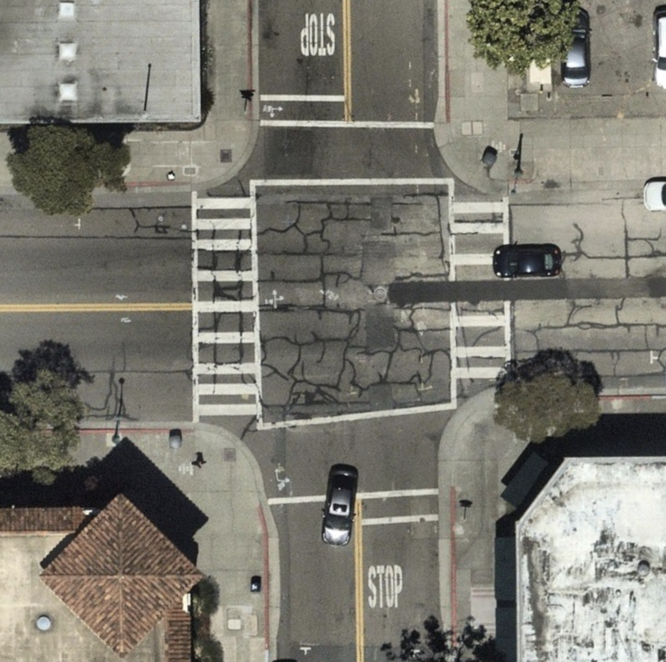 - a four-leg intersection with marked crosswalks (with "zebra" markings for two of the legs) for pedestrians
