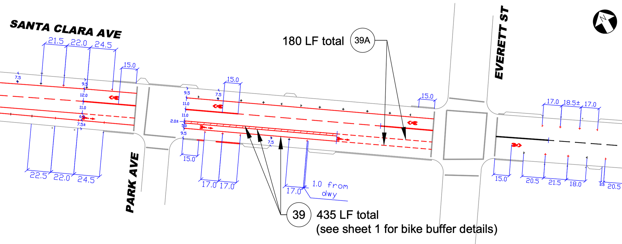 The mixed news is that bike lanes are included to this project as a convenience, not as a necessity. Existing bike lanes will extend further along Santa Clara Ave than they have before — that's nice! — but the lanes will end without ceremony at Santa Clara and Everett. The intersection looks, at least on my read of my read of these plans, as if it will be just as awkward for cyclists after the changes as it was before the changes.