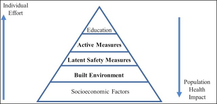At the top, education calls on much individual effort, with comparatively little impact on the health of the overall population. Next, active measures like seat belts, helmets, safety-related signage, or enforcement by an officer. Latent safety measures are less noticed but have a wider impact — for example, speed limiters in cars, signal timing to encourage slower traffic, or automated speed enforcement. Built environment includes the physical design of streets and their surroundings. Finally, socioeconomic factors includes the context around these streets — for example, land-use and housing policies that enable (or do not enable) people to live near where they work or live within a short trip to their daily necessities.