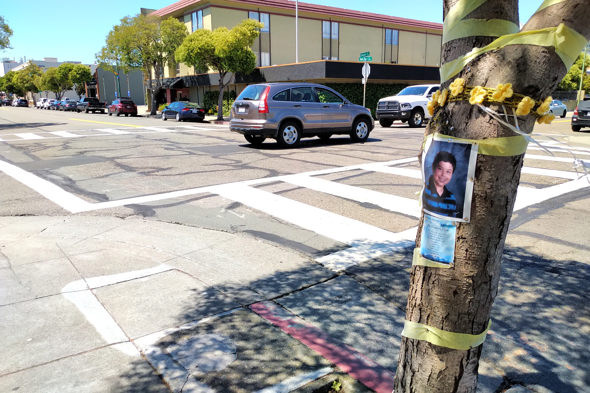 Some streamers and a photo marked the intersection at which, 10 years earlier, a young Alameda resident, who was riding his bike at the time, was killed by the driver of an SUV: